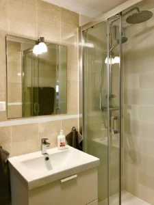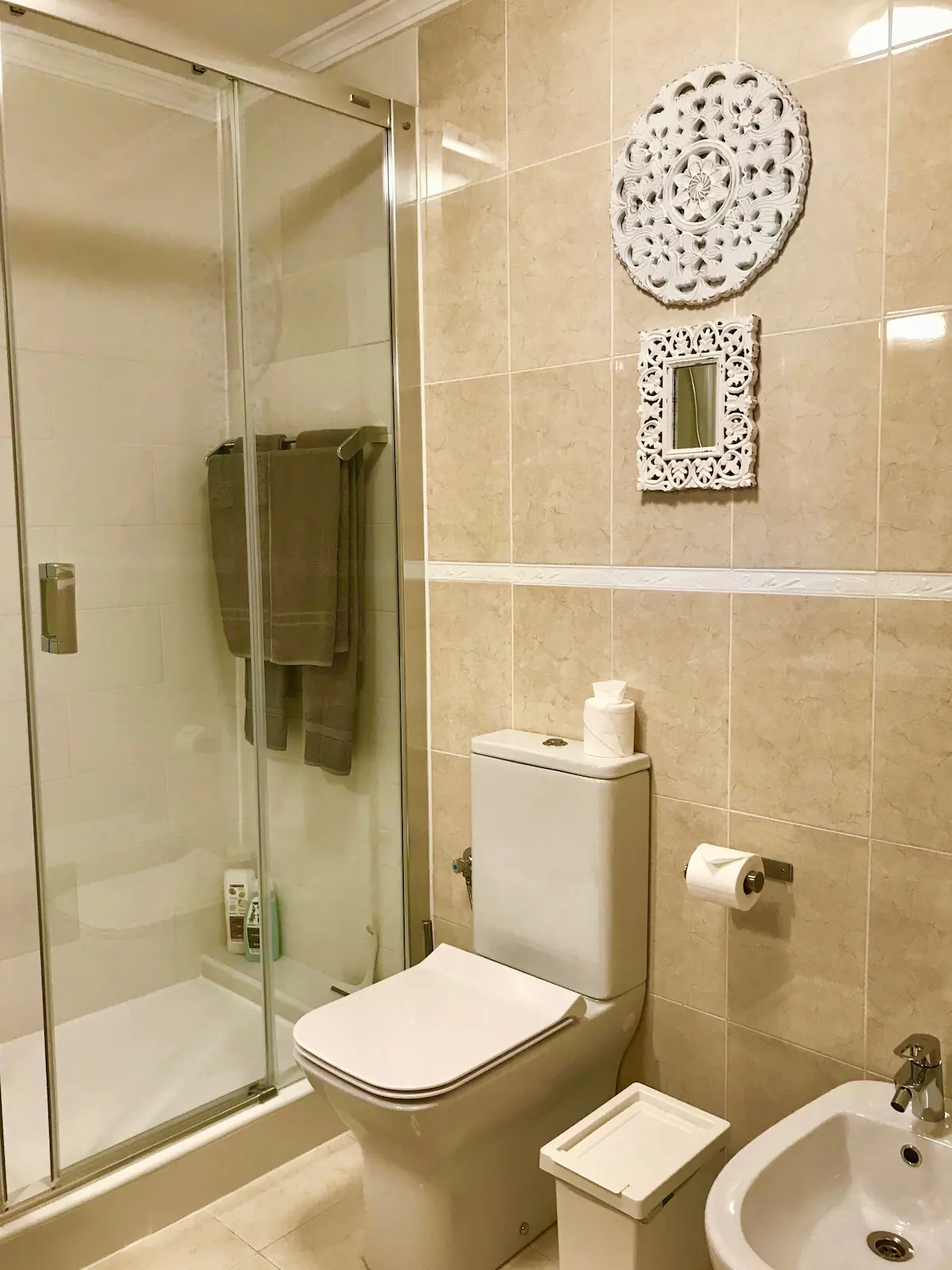 * lujoso baño con lavabo, wc, bidet y gran ducha a ras de suelo (75 x 170 cm) equipada con lluvia y ducha de mano